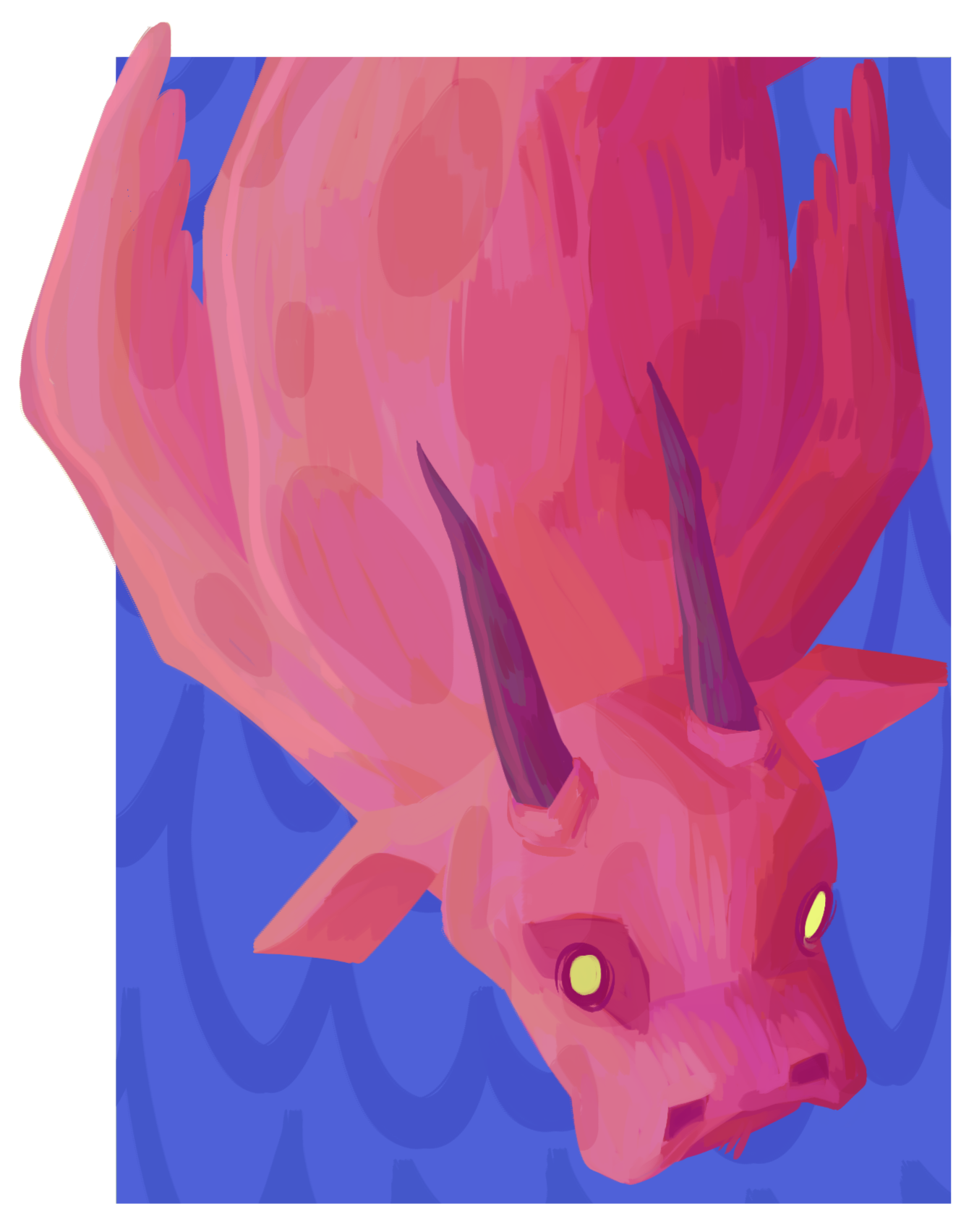 Criatura con cabeza de vaca y cuernos grandes, con cuerpo gordo, similar al de una foca o lobo, habita en el mar del sur de Chile.